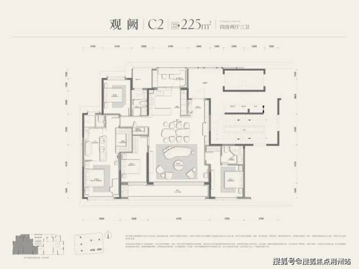 户型方面,高层建面约225㎡南厅户型分C1、C2两种类型,除了C1户型主卧为L型转角窗以外,整体布局差异不大。