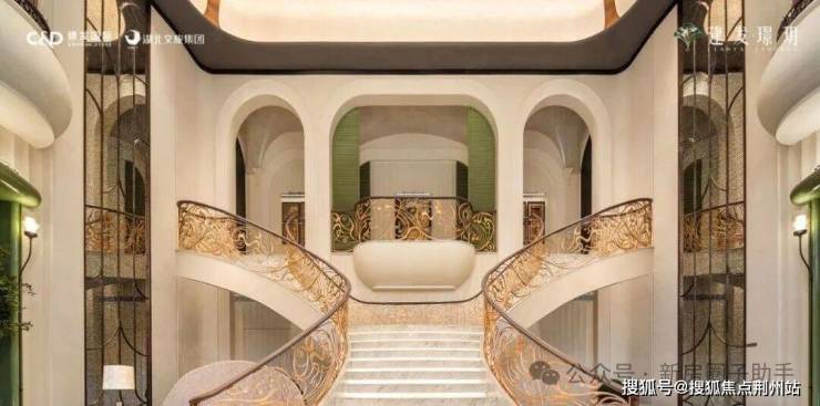 穿过大门就进入了挑高约10米的中庭,这里也是会所的接待大堂,借鉴了厦门千万级豪宅宸启瑞湖的海派美学基因。花瓣式艺术吊灯、南洋釉彩地砖、Art Deco珐琅彩玻璃、双向旋转楼梯......每一处细节,都是对卓越品位的精准表达。
