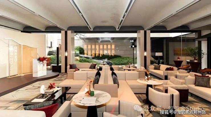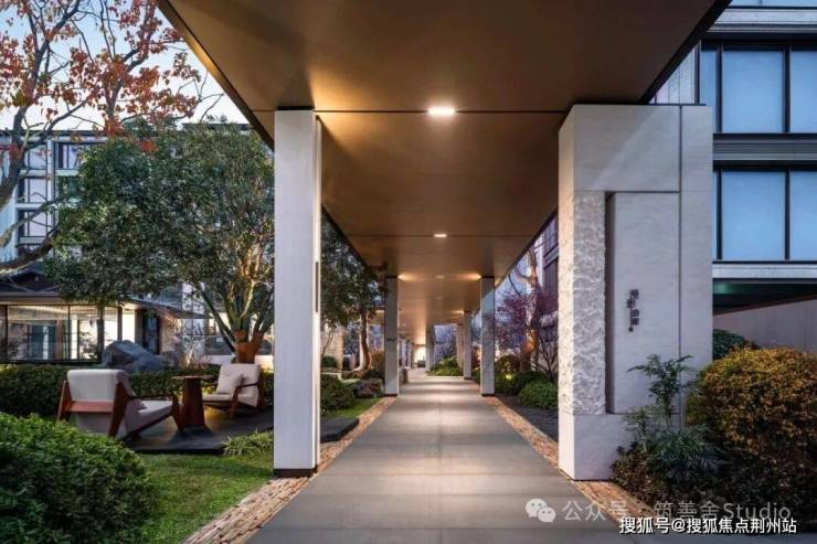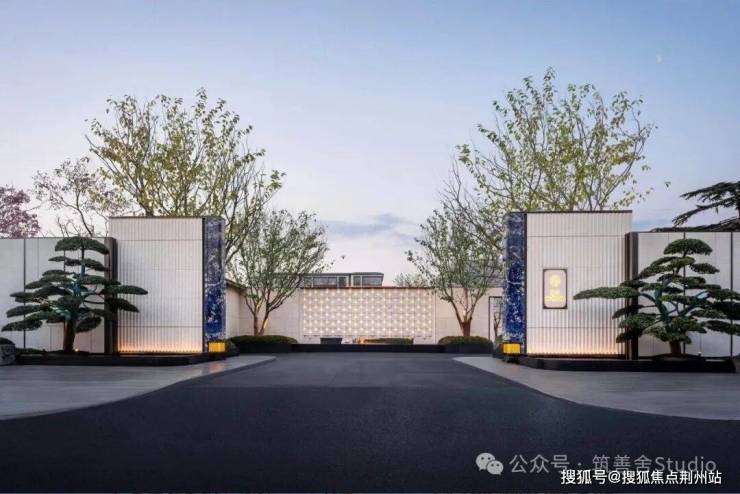殿堂级恢弘门头,一眼足以震撼心灵,这便是楼盘大门的封面级尊崇感。入口处两株逾60年树龄的罗汉松,静立门前,尽显岁月沉淀。步入大门,四株高大对称的丛生朴树,树干笔直挺拔,树冠广袤雄浑,墙隅处造型独特的乌桕树隐约可见,枝丫向上伸展,饱含无限生机,营造出静谧闲适的自然氛围。最令人瞩目的是整面源自保加利亚的维纳多石材,两侧更以顶级奢石景泰蓝(这个景泰蓝真的太好了。简直就是点睛之笔)进行撞色处理,蓝白交织,奢华气息迎面而来。