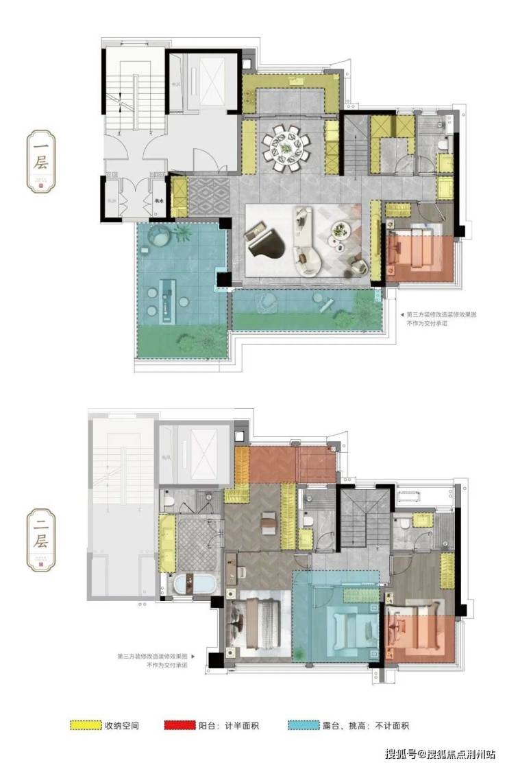 上叠建面约270㎡附赠露台约44㎡+挑空约20㎡+阳台约12㎡;下叠建面约350㎡附赠花园约40㎡+挑空20㎡+阳台约8㎡。