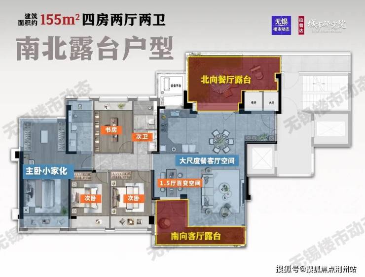 建面约155㎡南北双露台户型,实际使用建筑面积约182㎡,实际使用率可以达到约118%。