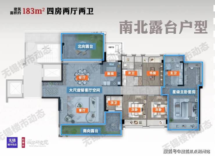 建面约183㎡南北双露台户型,实际使用建筑面积约214㎡,实际使用率可以达到约116%。