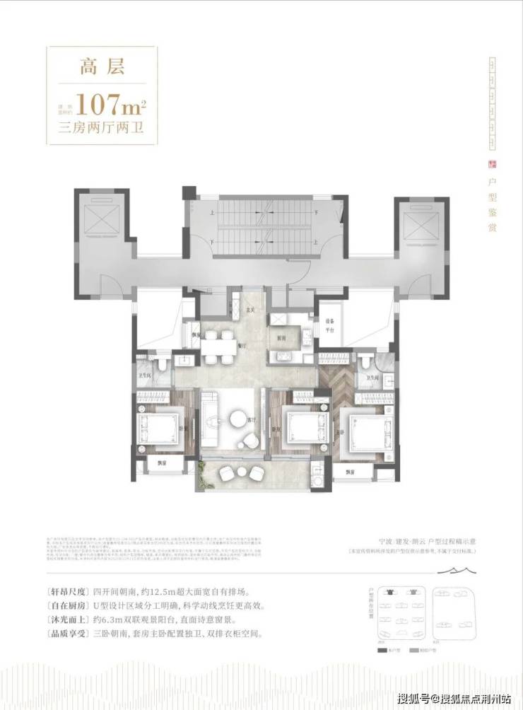 高层107 户型:四开间朝南、正三房、双套卧、无暗间