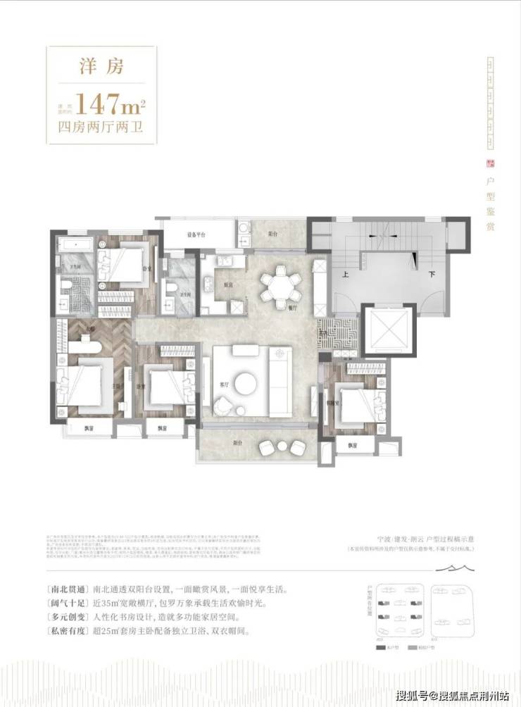 洋房147户型:南北双阳台、独立餐厅、正四房、无暗间、主卧四件套