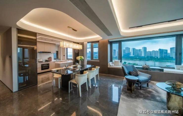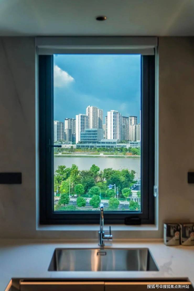 在LDKB一体化央厅中,厨房、餐厅、客厅三段空间的窗景设计,让奉化江景入境不同生活场域。