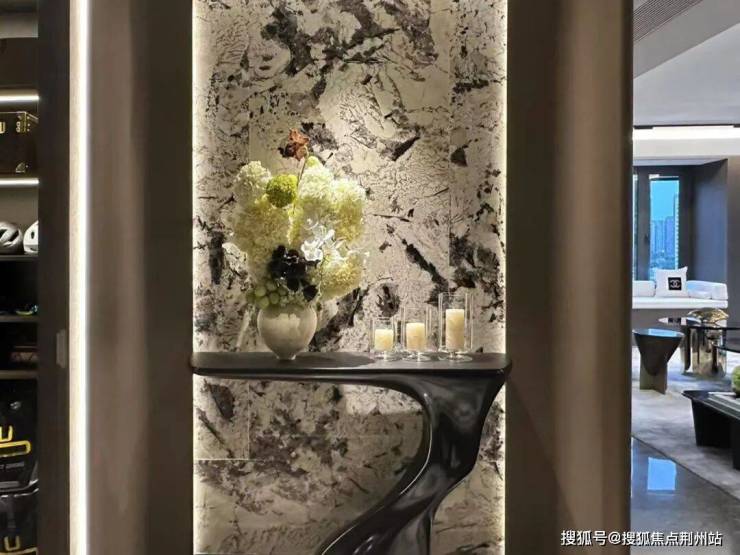 入户门庭镶嵌源自巴西的冰川翡翠天然奢石,自然清隽的灰白绿色泽,水波的流动纹理,为空间增添优雅纯粹的质感。