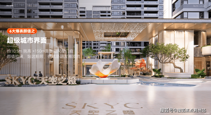 比如,光是一个小区大门头尺度就有大概150米,门头有10.5米的挑高。从效果图来看,门顶还有星空顶,门前有艺术雕塑+水景,两侧还有名贵的树,前场地铺也很高级...