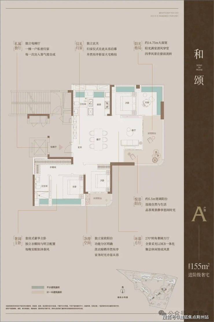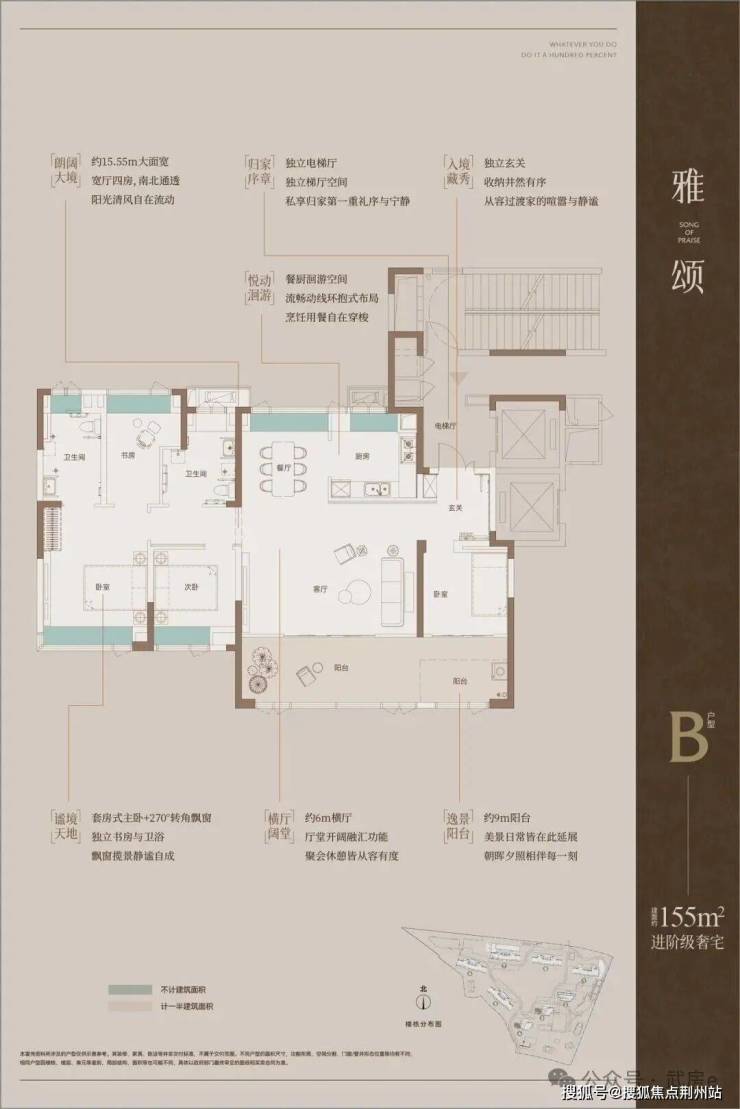 该楼盘主力户型建筑面积为110-155平方米,拥有三房两厅两卫和四房两厅两卫等户型,其中建筑面积约155平方米的户型拥有270°全景舱视野,得房率达95%。