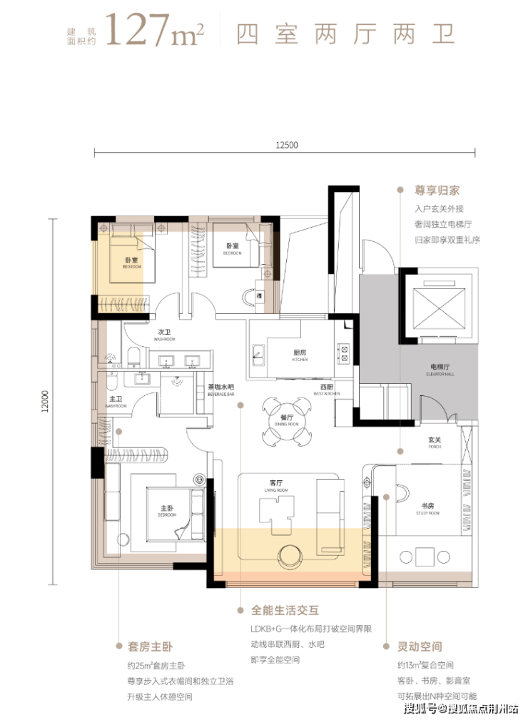 建面约127㎡户型,是整个小区最小的户型,相对来说,门槛也最低,但是其空间的尺度、功能的全面做得非常饱满,对于首置一步到位,或者核心区首改,都是难得一见的优选。