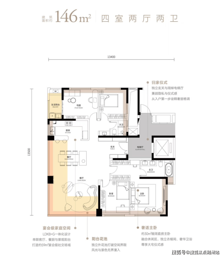 当然如果大家追求更大的空间感,项目1号楼还有少量建面约146㎡房源,该户型空间尺度更阔绰,甚至最多能达到四面采光。