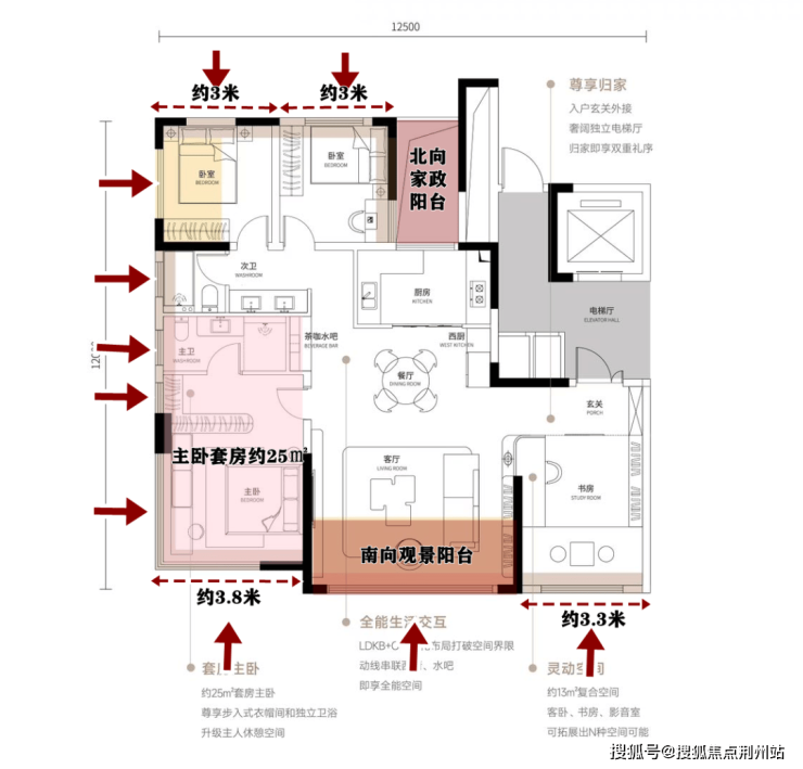 整个户型南向采光面约12.5米,同时,东西边户为三面采光,全屋10个采光面,全部明厨明卫无暗房,室内通风采光双绝杀。