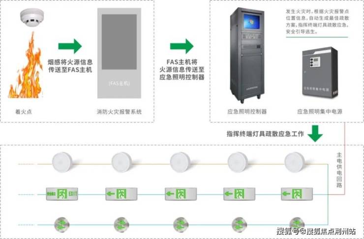 “智能疏散系统”是由智能疏散系统控制主机、消防应急电源、消防应急标志灯具、消防火灾报警主机,火灾探测器等多种设备组成的一套智能消防疏散系统。该系统具有人机交互界面,可对应急标志灯具实时巡检、并与报警主机系统联动、在有火灾发生时,根据起火位置智能选择最佳逃生路线进行疏散指示。