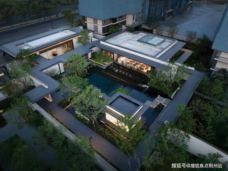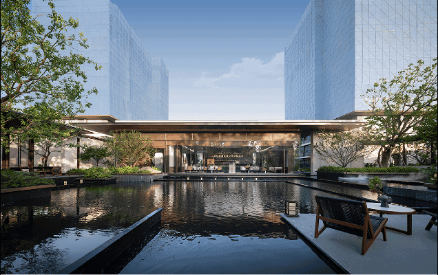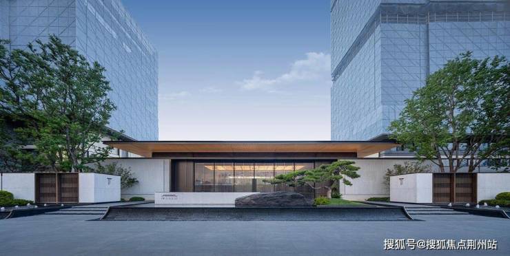 新中式极简美学,打造昆石同色石头,搭配现代铝材、高透玻璃,镂空金属、木纹铝板、错缝石材,演绎山水纹理,塔冠设计将中式屋檐与现代美学相融合,彰显东方大气恢弘之势。