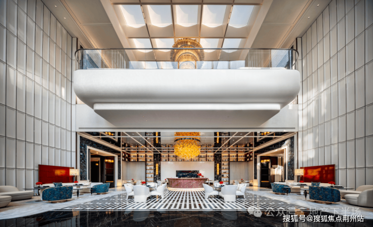 约15米挑高的翡丽大堂让这场惊艳抵达巅峰,空间尺度达到美术馆级别。抬眼望去,Barovier&Toso凤羽水晶灯正悬在大堂中央,无数水晶片如羽翼般展开。这可是曾照亮过Louis Vuitton橱窗、点缀过宝格丽酒店的百年品牌匠心之作,此刻在这儿静静闪耀,连空气都染上了几分奢华的光晕。