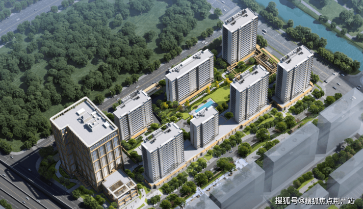 沿街带底商,外立面有香槟色金属点缀,搭配蓝色玻璃,侧面立面颜色目测为浅灰,较为大气。