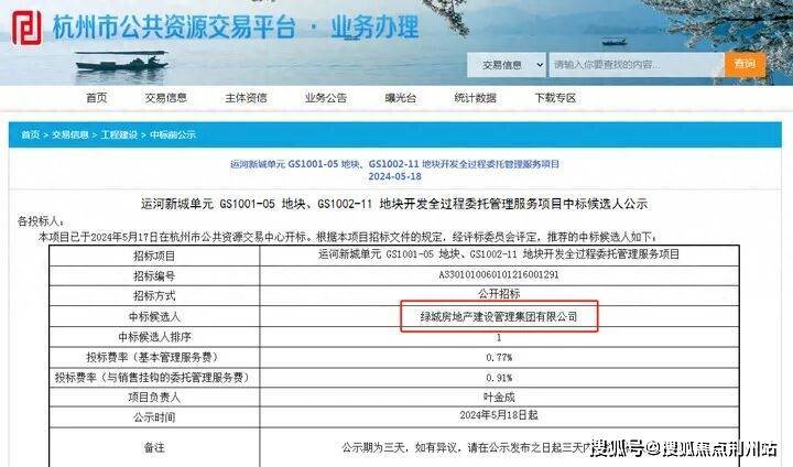 之后根据官方通告称,运河新城单元GS1001-05地块、GS1002-11地块中标候选人为绿城房地产建设管理集团有限公司,意味着绿城将参与地块的后续开发的品牌使用、项目代建、房产销售等服务。