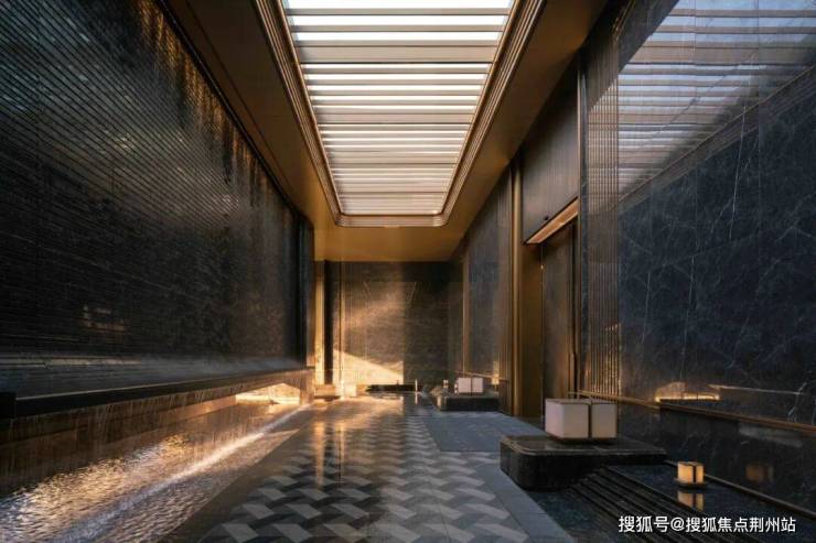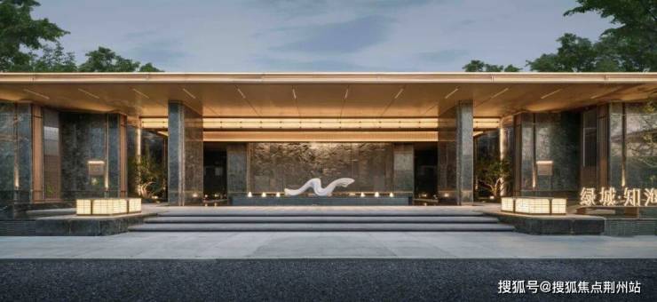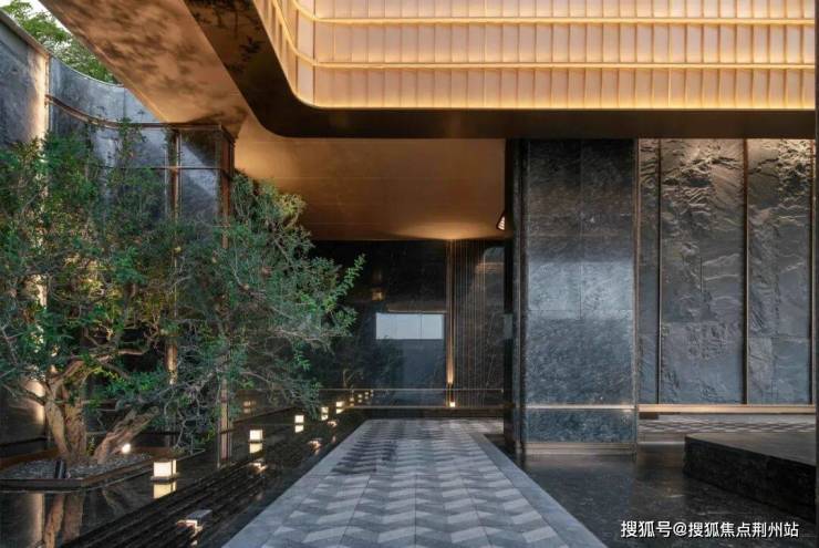 主入口空间向内退让,形成有温度的城市边界。52m超长门头水平横向舒展,既遵循中轴对称的传统礼仪范式,又以简约线条、奢华材质与极致工艺呈现艺术、轻盈的雅奢格调。前场庭院以“洄游”为理念,重构“四水归堂”的空间序列。