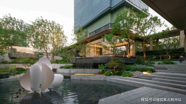 穿过接待大堂,进入下沉庭院,水面清浅,白色雕塑烘托着艺术氛围。循着连廊拾级而上,树木葱茏,叠水倾泻,移步易景;视线随之攀升,建筑与庭院互为渗透,内外、上下空间实现自然过渡。