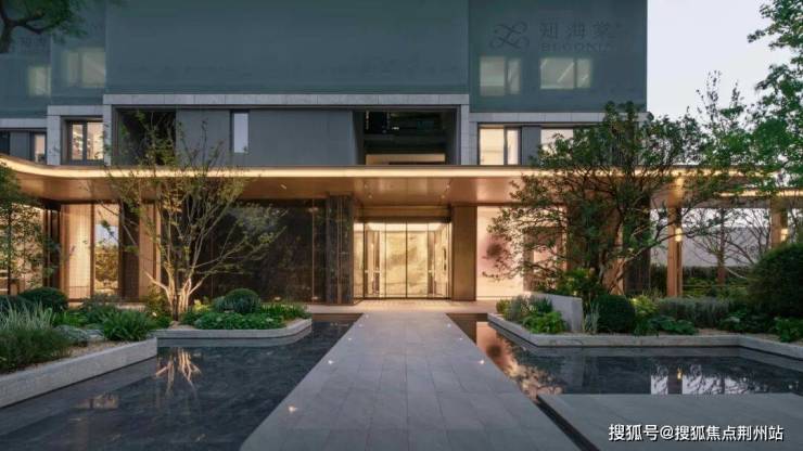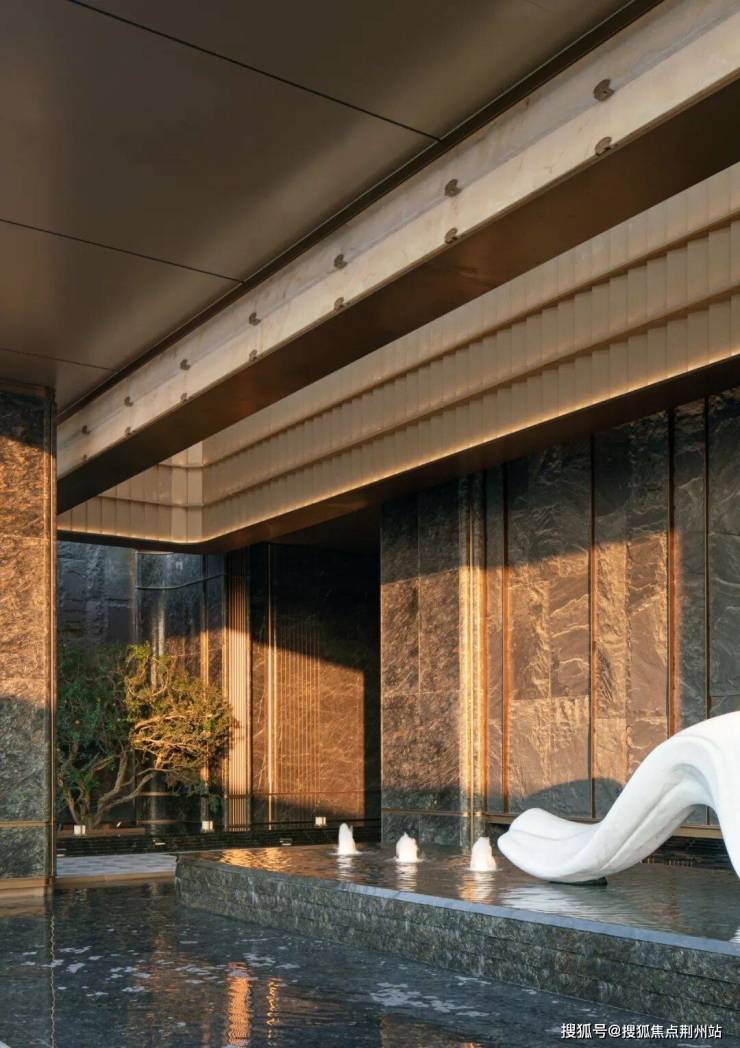 由青松指引,自景墙两侧进入内庭。景墙背后水幕潺潺而下,冲淡城市的喧嚣,沉淀出一方静候空间;经由艺术铜门进入园内,展现门庭礼仪。