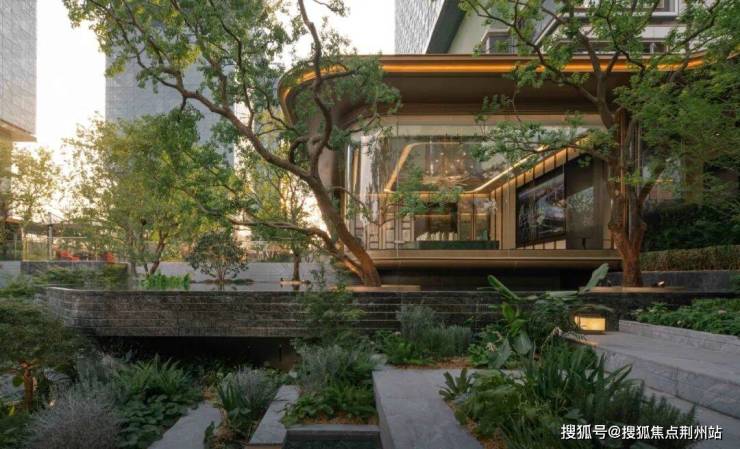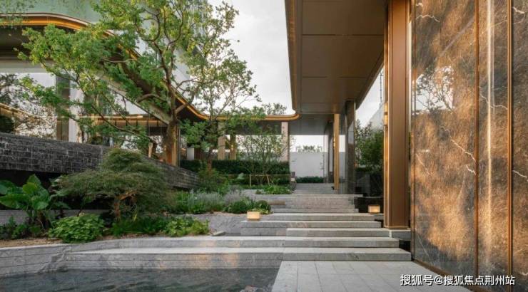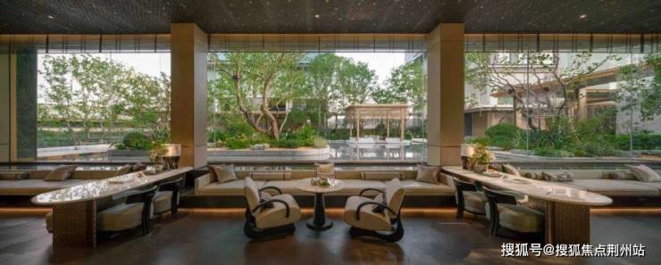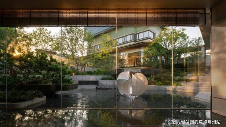 穿过铜门,进入接待大厅,透过一片落地玻璃窗,一幅园林画卷徐徐展开——叠水佳石、立体游廊,曲折尽致,颇具园林逸趣。