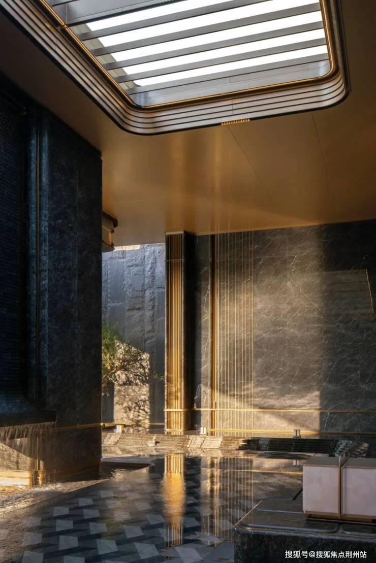纤薄的金色铝板华盖自中央开启一方天井,由白雪公主奢石拼合成一顶华冠,映照入口庭院空间。由老石皮奢石砌筑而成的景墙斑驳嶙峋,与深色水池承托的洁白雕塑对望而立,在时间的影像里叙述着人工与天然的微妙联系。