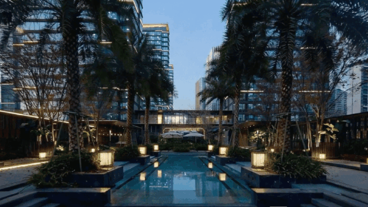 和普遍意义上的风景园林设计不同,天樾玺的景观,从设计之初便不仅为了观赏,更为了沉浸式的生活。如今,社区园林已美好可见:中央主轴以泰国四季酒店为蓝本,水景潋滟、树影婆娑;静谧庭院融入苏州悦榕庄的东方美学,步移景异,心境随之宁静。这里的每一棵树、每一处水景,都以最为舒展的状态,迎接着未来业主的到来。在渴望“即时疗愈”的当代生活中,天樾玺让回家成为一场无需远行的度假。