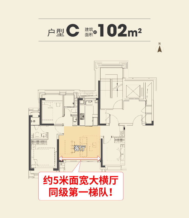 金隅·公园东序建面约102㎡3房,直接做到约5米横厅客餐厅,在市面98–102㎡面积段里,稳居第一梯队。