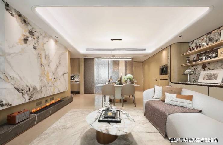 其二,含“奢石量”超高,审美质感在线。客厅地板选用土耳其进口石材,主卫台面为云顶白石材,玄关台面采用雪山银狐奢石。