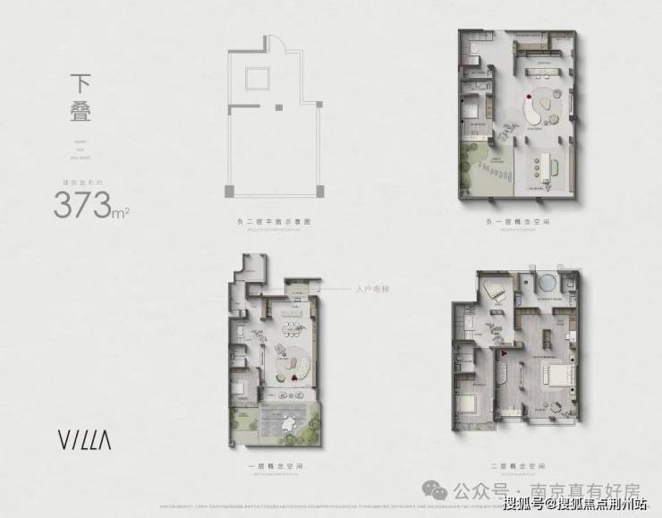 共4层,三重入户方式(南北入户,地下二层入户),一层有花园,负一层有挑空庭院,独立车库。