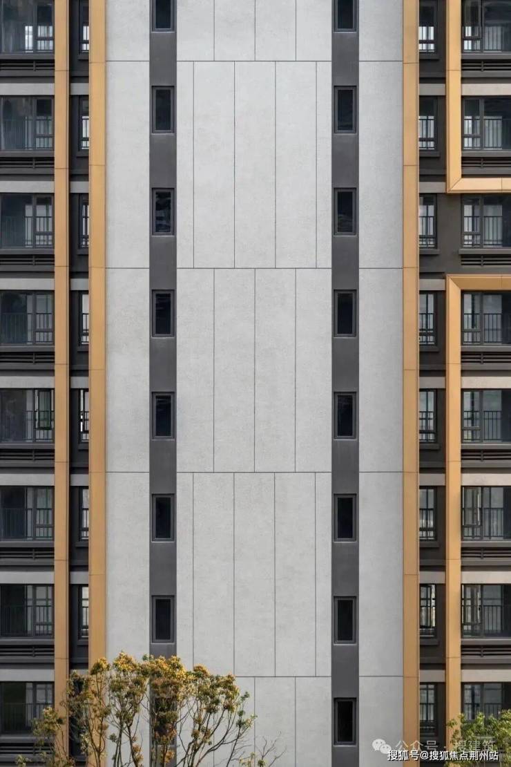 四川师大站TOD·锦江府·南苑,设计统一并合理考虑了室外空调机位的隐蔽设计,竖向铝板格栅不仅遮挡了设备平台,更增加了建筑的线条感。