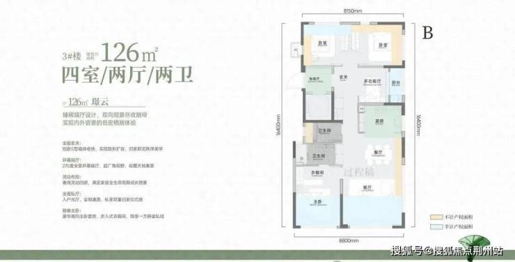 该户型入户S墙设计,客厅和主卧有大半面积是阳台优化而来,厨房和餐厅也是半计产权面积。