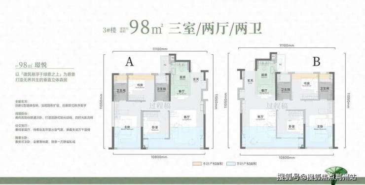 建面约98平三房两厅两卫:3号楼的连廊中间套户型。