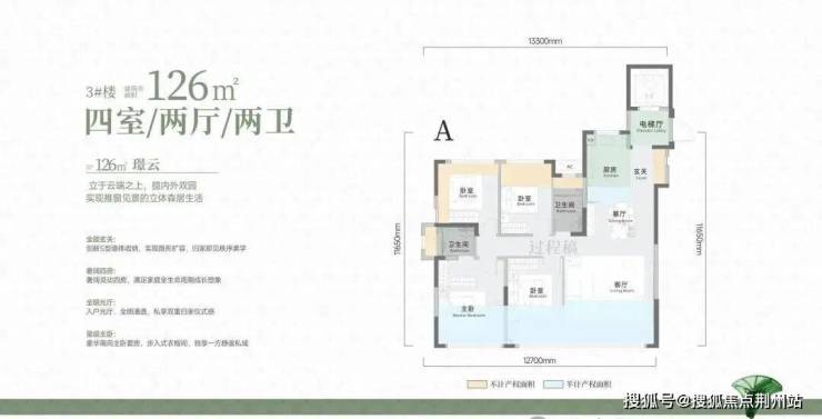 独立电梯入户,270度客厅视野,进门的多功能区外面带有晾晒阳台,北侧卧室双面优化,不足之处就是进深较长。