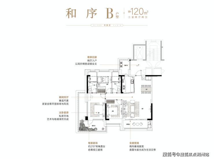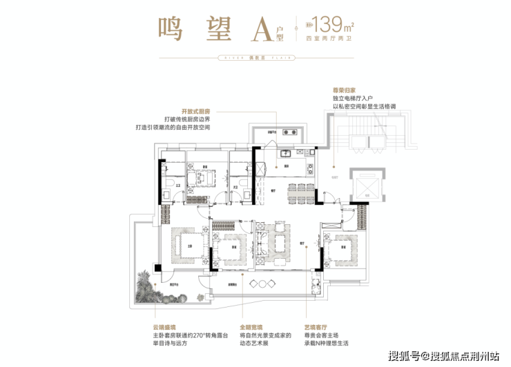 南向主卧星级套房,主卧双面采光与270°露台无界相连;