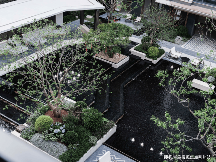 约70米长的单面悬挑结构风雨连廊,为业主打造的专属归家礼序,连廊两侧,奢石与跌水潺潺相依,宛若一幅流动的江岸生活画卷徐徐展开。