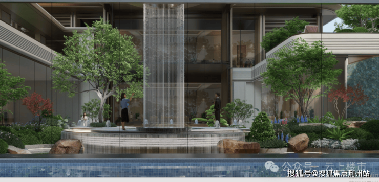 从新加坡樟宜机场的“森林瀑布”中汲取灵感,并结合“落水山庄”的造景意象,作为整个下沉水院的点睛之笔,水幕如绸缎般垂落,将时间包容进水珠倾流的微声翠鸣里,让岁月自然慢下来,沉静都会喧嚣,勾勒出难得的水漾松弛感,并灵动演绎“进门见水,流水生财”寓意。