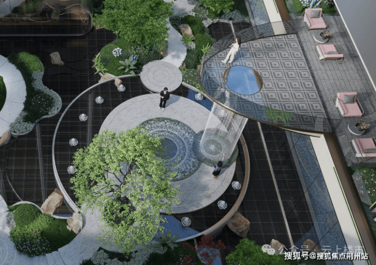 从迪拜棕榈岛的月牙圈(Crescent)中汲取灵感,以涡流月形水景布置,多重几何形态的水韵,贝金米黄玉带搭配蓝翡翠玉盘沉稳典雅,灵动交织,又赋予中国传统诗词中“大珠小珠落玉盘”的场景写意。