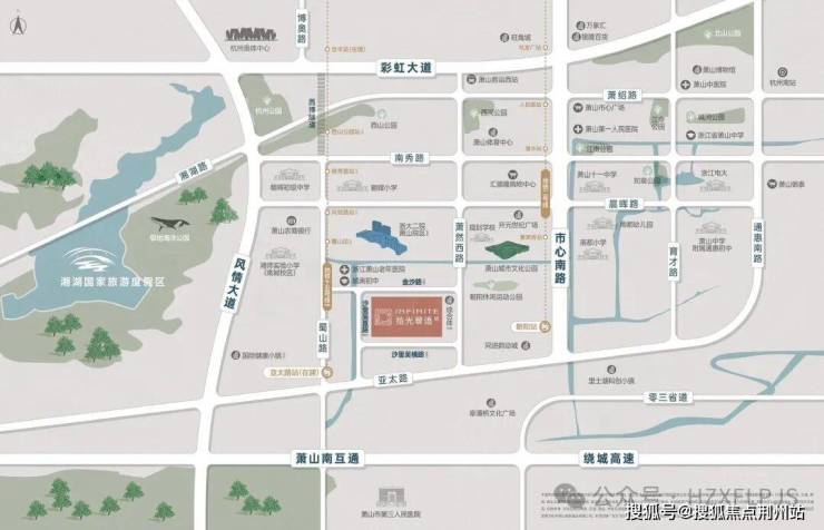 7大城市公园环绕,其中构建“五馆合一”的萧山城市文化公园约2公里,附近还有湘湖风景区。