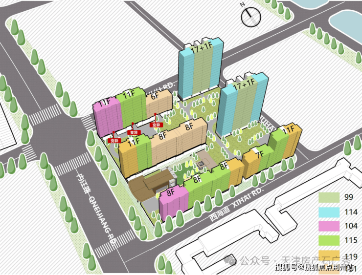 小高层面积为99、114平米,洋房面积为104、115、119、131平米。预计十一左右开盘。