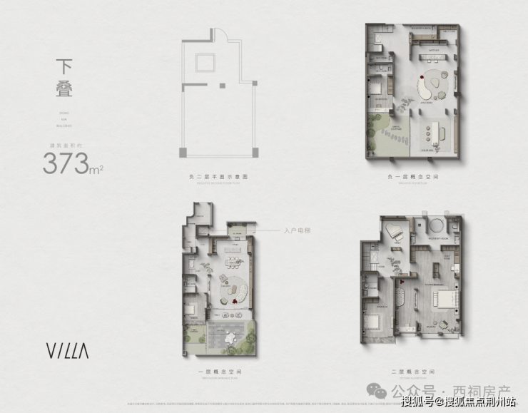 【上叠】共5层实际使用空间,负二层独立车库,负一层挑空庭院,一层入户空间,3-5层位核心的居住使用空间。