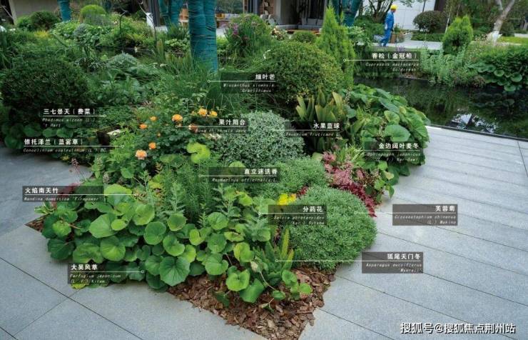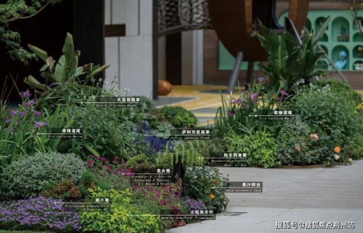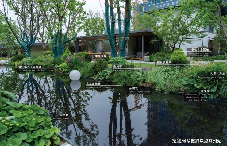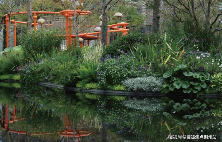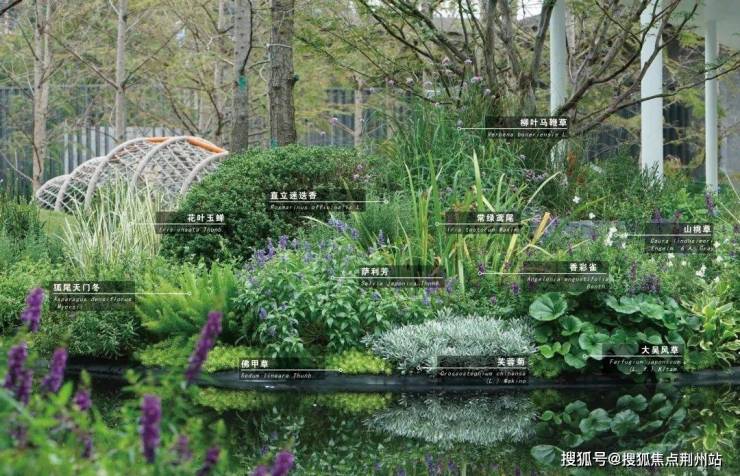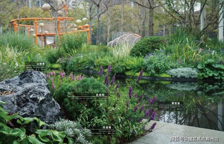 水边自然花境生机盎然,以香松、瓜子黄杨球、水果兰球、八角金盘作为常绿骨架,配以直立向上的木贼、桑托斯马鞭草、常绿鸢尾、大麻叶泽兰等中层,散植樱桃鼠尾草、蓝雾草;前景布置迷迭香、美女樱、分药花、蓝花鼠尾草、大吴风草、红盖鳞毛蕨、芙蓉菊、金叶石菖蒲、矾根等,多年生与一二年生宿根花卉搭配,增加群落稳定性和景观长效性。