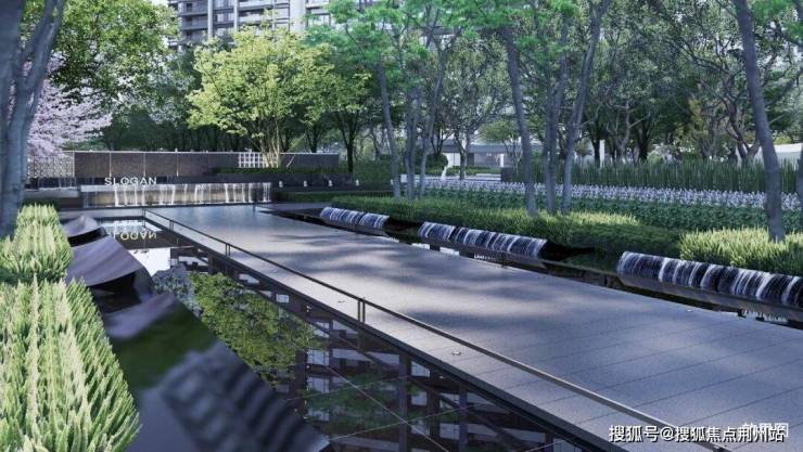 一进酒店式门庭,银灰色铝板与浅灰石材营造迎宾质感;灵动水系构建轻盈漫步归家氛围;开阔中庭,渐入从容的归心之旅。