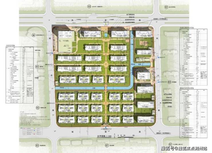 在技术指标上,我们清晰的看到,排屋、洋房、小高层,全都是200㎡以上的户型,纯改善配置。除此之外,还有2栋14层和17层的商业办公楼,以作他用。我们大概测试了一下,从小区步行至南湖,不过200多米,而小区的小高层是可以穿过西面的栖凤苑,直望湖景。