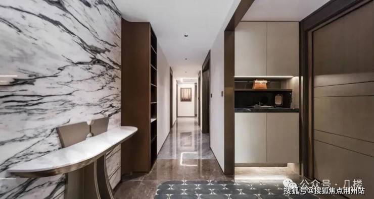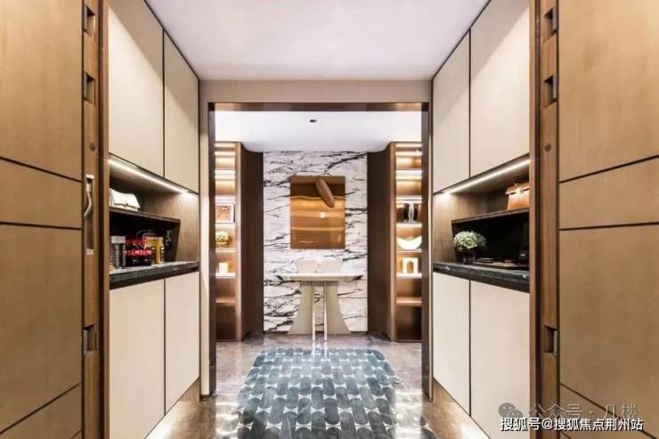 再看进门之后的感觉,石材拼花的地面铺设,奢石上墙的入户玄关,五星级的入门仪式感有了。