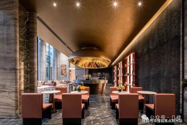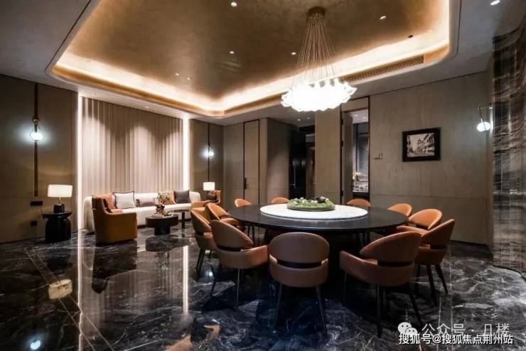 地下一层的挑高会所接待区,从地面、墙面的石材铺装,到铂金吊顶的极致璀璨,无一处不透着精致与奢华。
