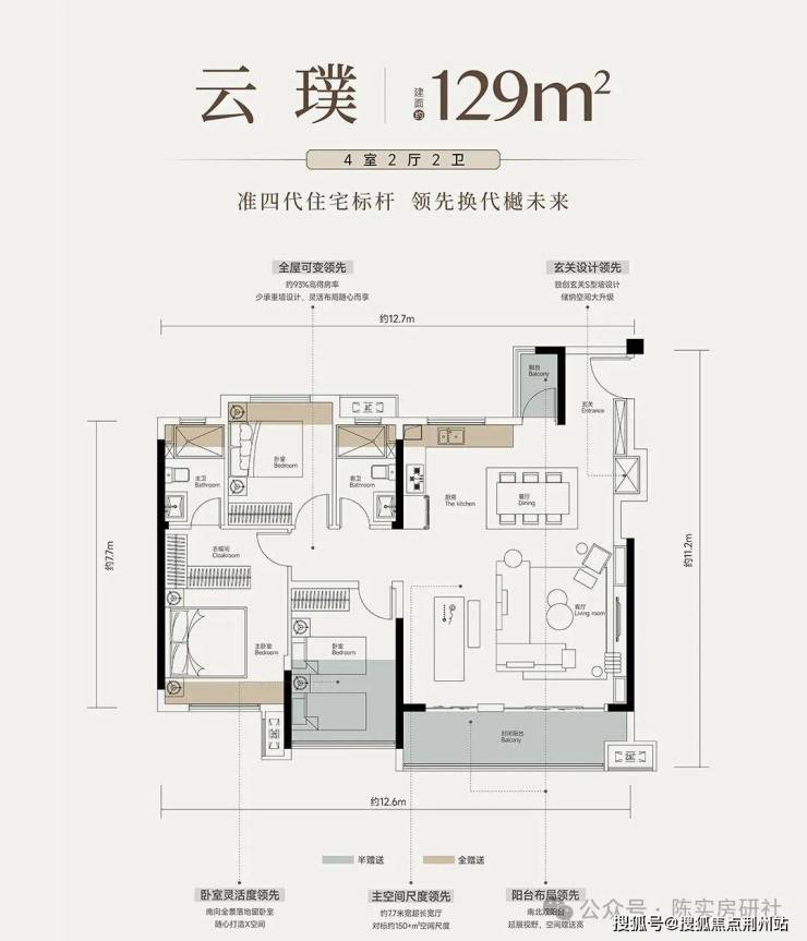 建面约129平四房两厅两卫:边户,南北通透,四开间朝南,三面采光,优化空间较多,户型方正且动静分区,主卧独立卫浴和衣帽间,户型设计不错。