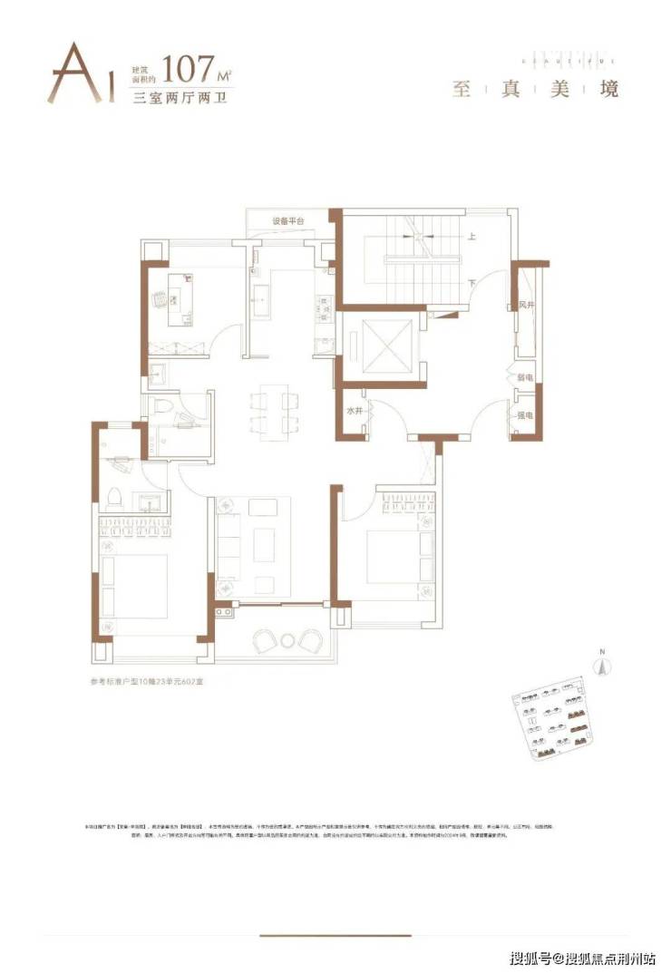 建面约107㎡3房2厅2卫户型