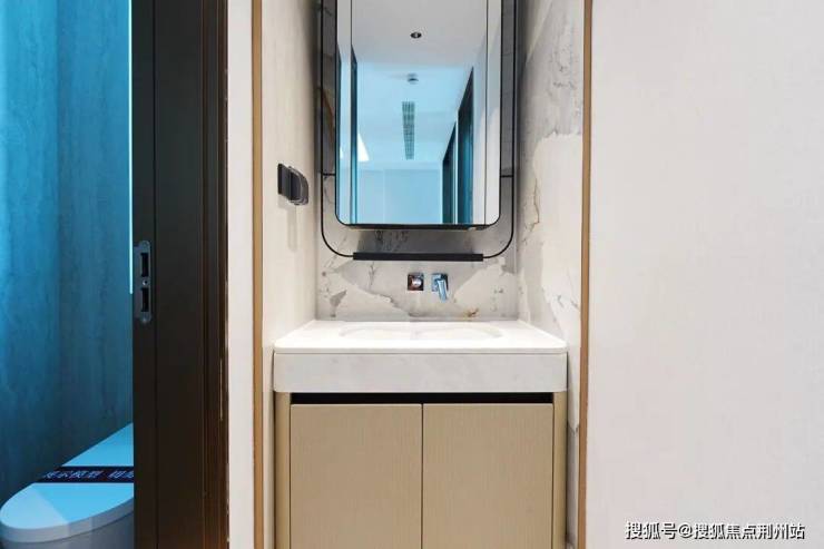 两个卫生间,主卧套房带独卫,客卫干湿分离。汉斯格雅花洒+龙头、杜拉维特台盆+洁具,两个镜柜均内置插座和消毒牙刷架,主卫镜柜更增配了美妆冰箱。