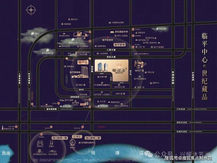 临平新芯:优踞临平新城核芯,也是杭州重点打造的城东新中心,紧邻临平新城管委会,直距临平区政府约1.6km,名副其实的行政中枢和临平CBD,堪称城市发展的价值引擎。