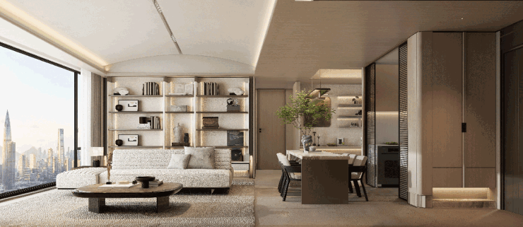 约7.1米开间、近40㎡的无界社交场域边厅,采用餐客厨一体化布局,全景落地玻璃窗引入无界视野,奢阔客厅可享270°环幕景观,无论是宴客或家庭欢聚,皆诠释通透大气的奢居意境。搜建筑